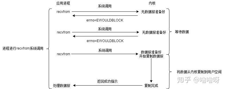 在这两个阶段中,用户进程只有在数据复制阶段被阻塞了,而等待数据阶段没有阻塞,但是用户进程需要盲等,不停地轮询内核,看数据是否准备好。