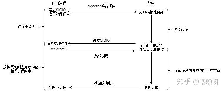 当数据报准备好的时候,内核会向应用程序发送一个信号,进程对信号进行捕捉,并且调用信号处理函数来获取数据报。
