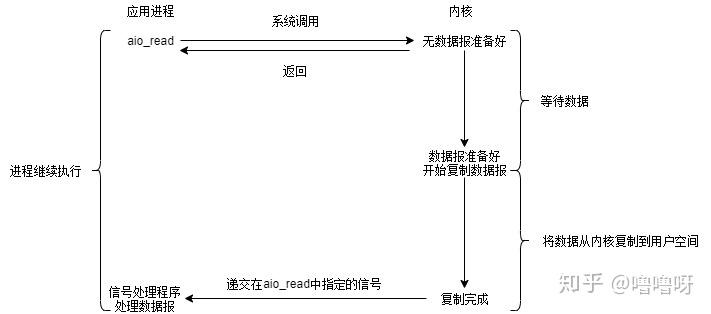 类比一下,就是用户进程发起系统调用后,立刻就可以开始去做其他的事情,然后直到I/O数据准备好并复制完成后,内核会给用户进程发送通知,告诉用户进程操作已经完成了。